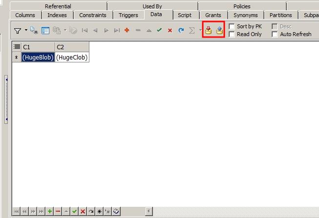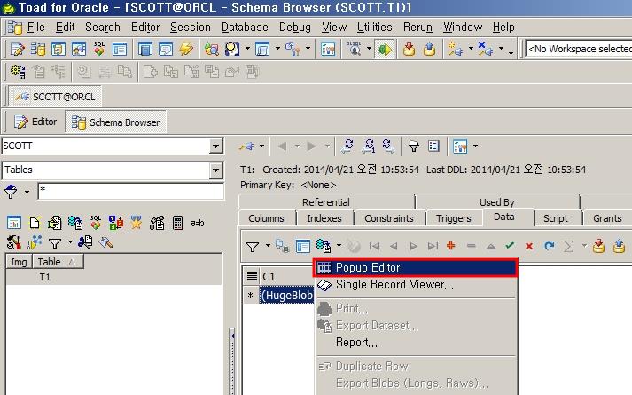 스키마 브라우저를 열어 t1테이블을 선택하고 오른쪽에서 Data 탭을 찾아갑니다. 기본적으로 Toad에서 LOB데이터는 아래와 같이 HugeBlob 형태로 보입니다.