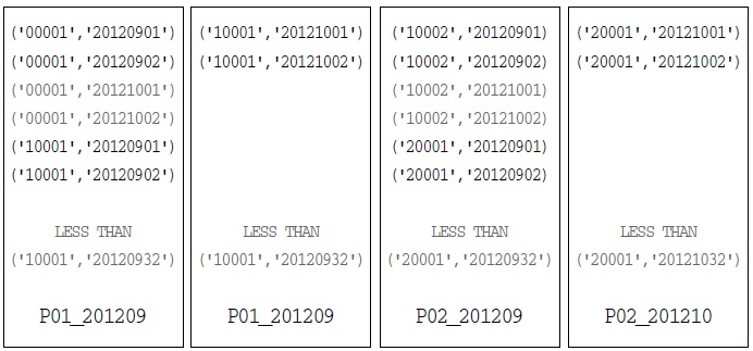 PARTITION P01_201210 VALUES LESS THAN ('10001', '20121032’),