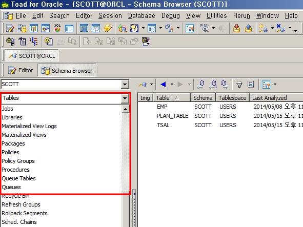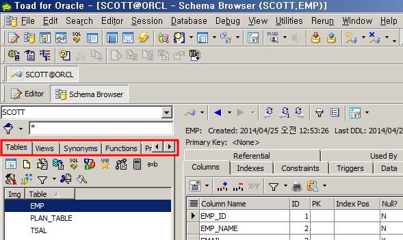 아이콘을 눌러 오브젝트의 목록이 아래쪽으로 펼쳐지게 하는 형태입니다. 스키마 브라우저의 기본 형태입니다.