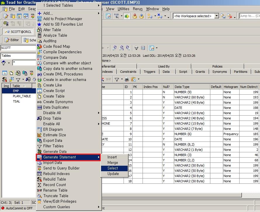 Toad의 스키마 브라우저에서 테이블에 관련된 select, update문 등의 DML 스크립트를 자동으로 뽑아낼 수 있습니다. 쿼리를 작성할 때 일일이 테이블의 컬럼 명을 다 써주지 않아도 자동으로 생성되기 때문에 빠르고 간편하게 작업할 수 있습니다.