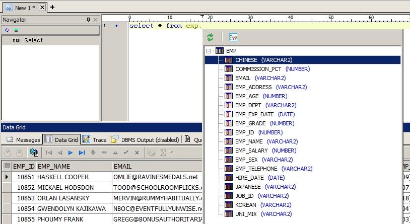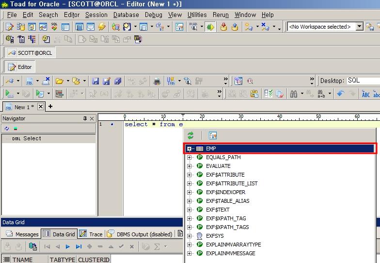 Toad에서는 Editor창에서 쿼리를 작성할 때 오브젝트 명이나 컬럼 명을 자동으로 완성해주는 Code Insight Pick List를 제공합니다.