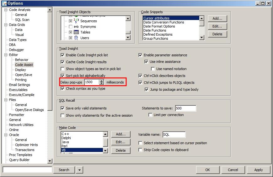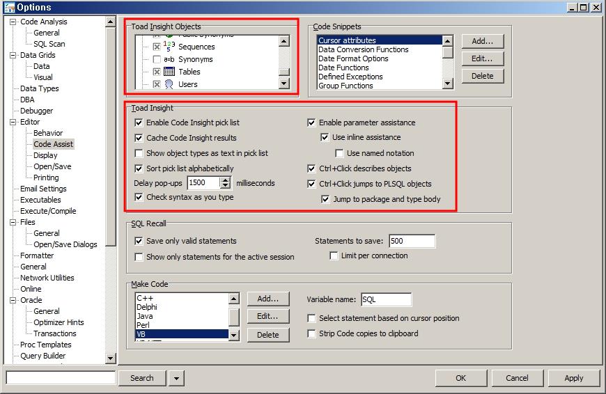 리스트에 보여지는 오브젝트는 Option에서 설정할 수 있는데 Menu > View > Toad Options > Editor > Code Assist 를 선택합니다. 또한 Toad Insight 부분에서는 자동 완성에 대한 구체적인 옵션을 지정할 수 있습니다.