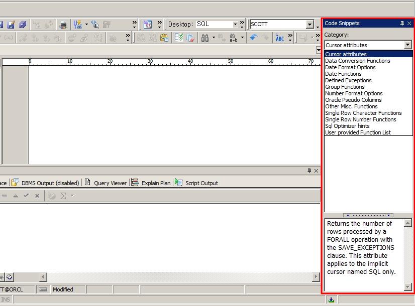 Menu > View > Code Snippets를 선택하면 화면의 오른쪽에 메뉴가 나타납니다. Code Snippet은 오라클이 가지는 함수, 힌트, 사용자 정의 함수 등에 대한 정보 및 사용법을 보여줍니다.