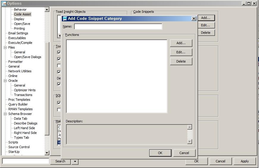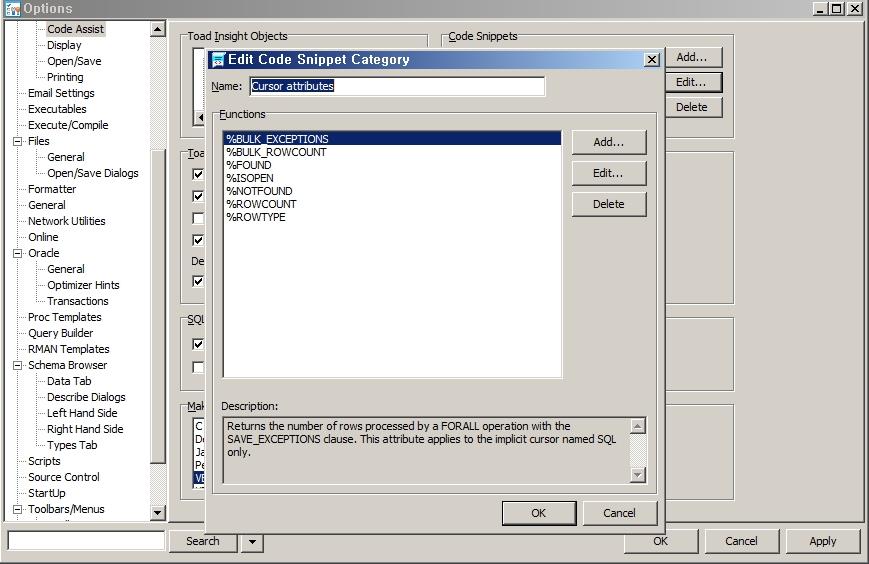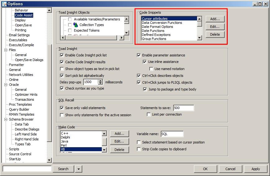 Toad Option에서는 Code Snippet을 추가, 삭제, 수정을 할 수 있습니다. Menu > Editor > Code Assist를 선택합니다.
