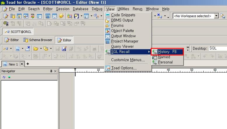 Menu > View > SQL Recall > History를 선택하거나 단축키로 F8을 선택합니다.
