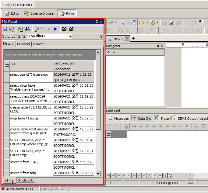 Toad는 수행된 SQL이력을 자동으로 Toad 내부에 보관하고 SQL Recall이라는 기능을 통해서 확인할 수 있습니다.