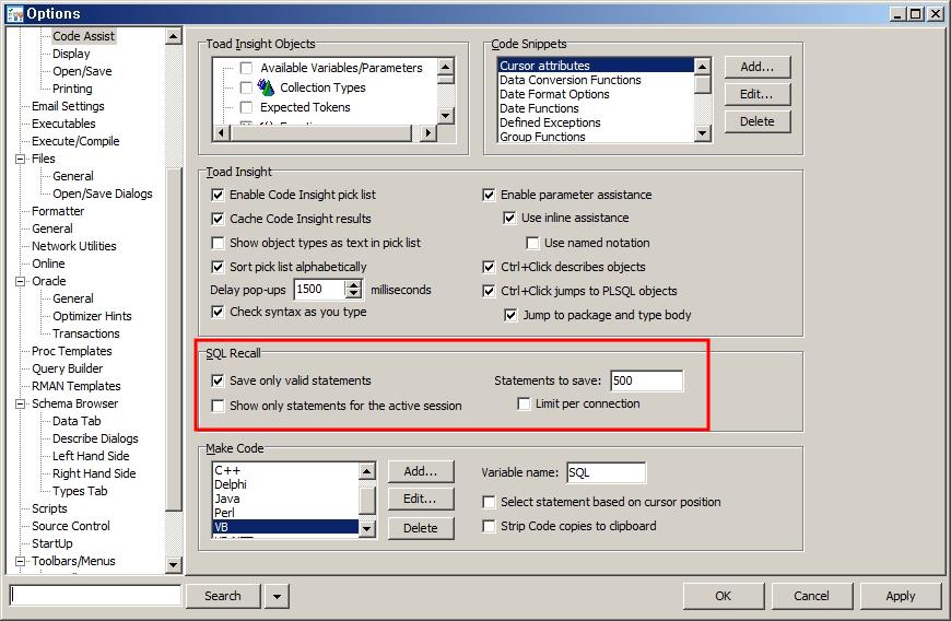 SQL Recall은 기본적으로 정상적으로 실행된 500개의 SQL까지 저장하도록 되어 있습니다. 이와 같은 설정은 옵션에서 변경할 수 있고 Menu > Toad Options > Editor > Code Assist을 선택하면 관련옵션을 확인하고 수정할 수 있습니다.