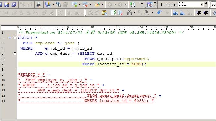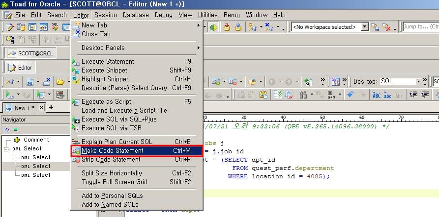 Toad에서는 SQL문을 어플리케이션 소스의 언어에 맞게 자동으로 변형시켜주는 기능을 제공합니다. Editor창에 SQL문을 입력하고 Menu > Editor > Make Code Statement를 선택하거나 단축키로 Ctrl + M을 누릅니다. 단, Editor 창에 있는 모든 SQL이 변형되며 특정 SQL문만 Make Code를 적용하고자 하면 드래그를 해서 블럭을 지정합니다.