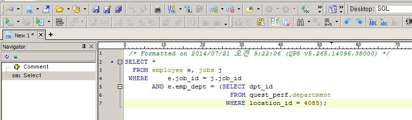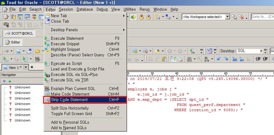 Make Code를 이용하여 소스 코드 내에 SQL문을 삽입을 했다면 반대로 소스 코드에서 SQL문만 추출하는 기능도 있습니다. Toad에서는 Strip Code라 부르며 Menu > Editor > Strip Code Statement를 선택하거나 단축키로 Ctrl + P를 누릅니다.
