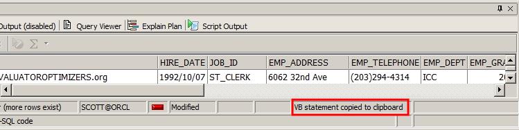 Make Code를 수행하면 변형된 SQL문이 클립보드에 저장이 됩니다. Editor창의 하단에서 메시지를 확인할 수 있습니다.