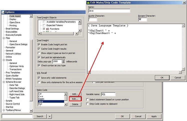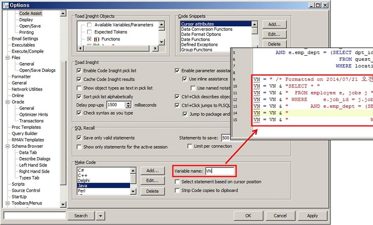 Toad의 기본 설정 언어는 VB(Visual Basic)로 되어 있으며 이 밖에도 C#, Java 등 총 7개의 개발 언어를 지원합니다. 또한 개발 언어에 따라 SQL문의 형태가 변경되며 Menu > Toad Options > Editor > Code Assist에서 아래 Make Code 부분에서 설정이 가능합니다.