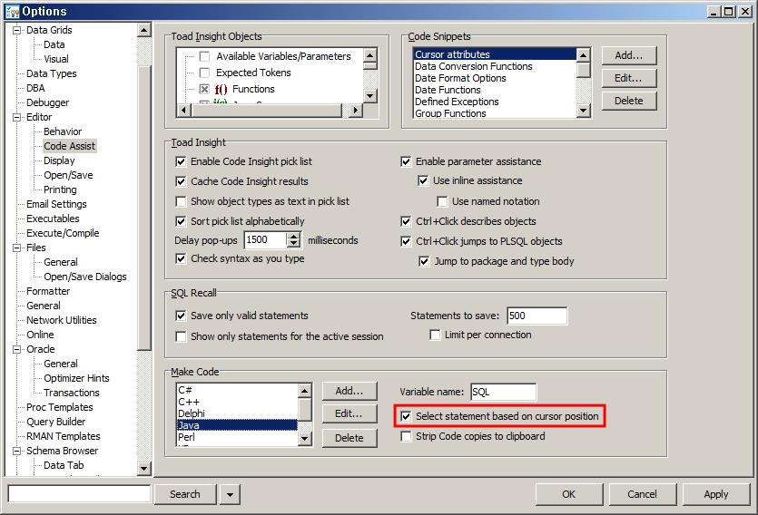 Editor 창에 여러 개의 SQL문이 있을 때 Make Code를 수행하면 Toad의 기본 설정은 모든 SQL을 변환합니다. Toad Option을 이용하면 현재 커서가 있는 단 한 개의 SQL문에 대해서만 Make Code를 지정할 수 있습니다.