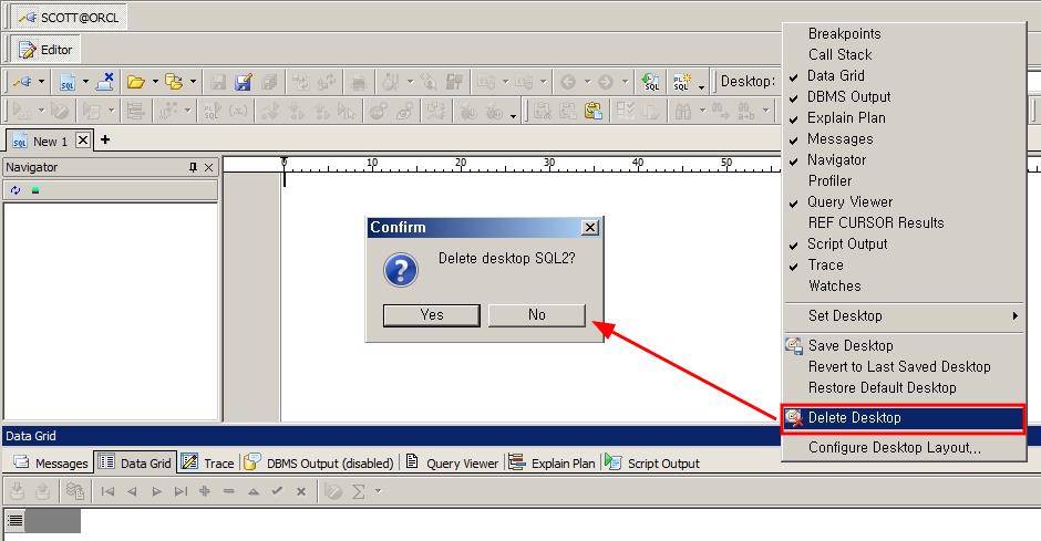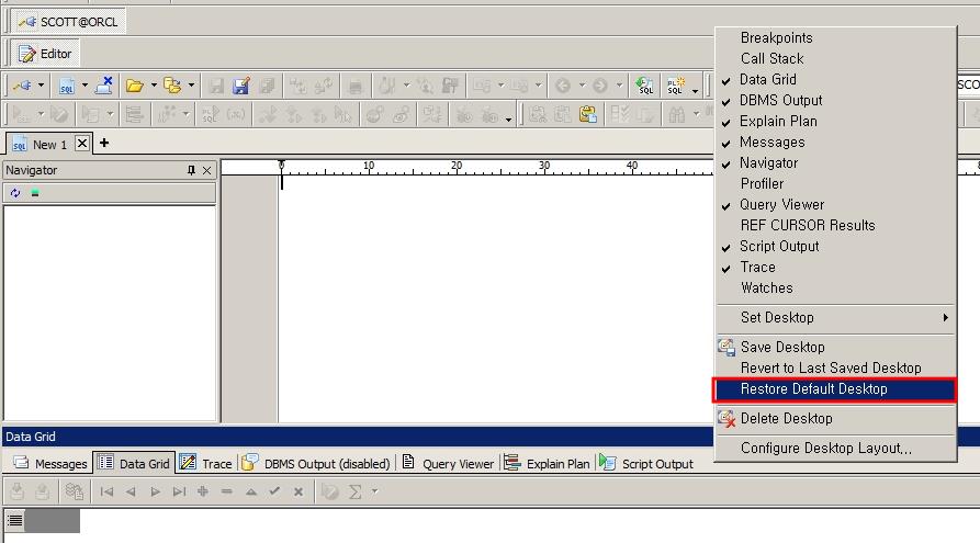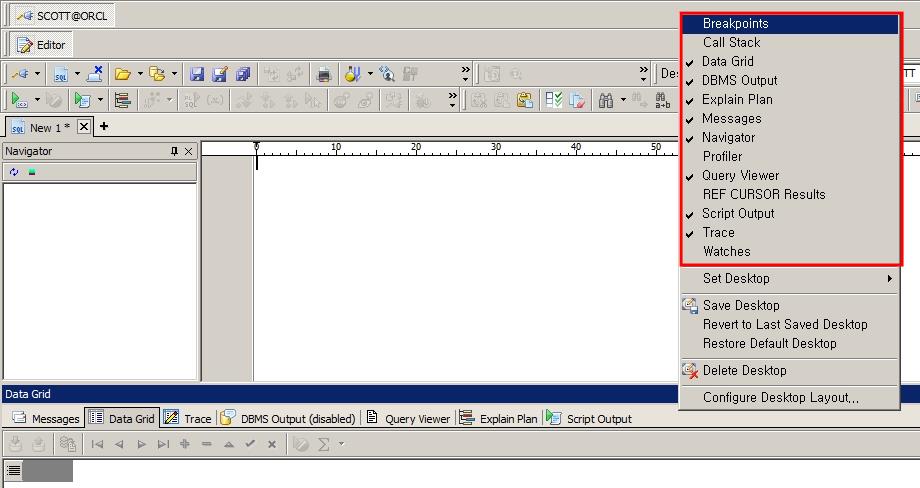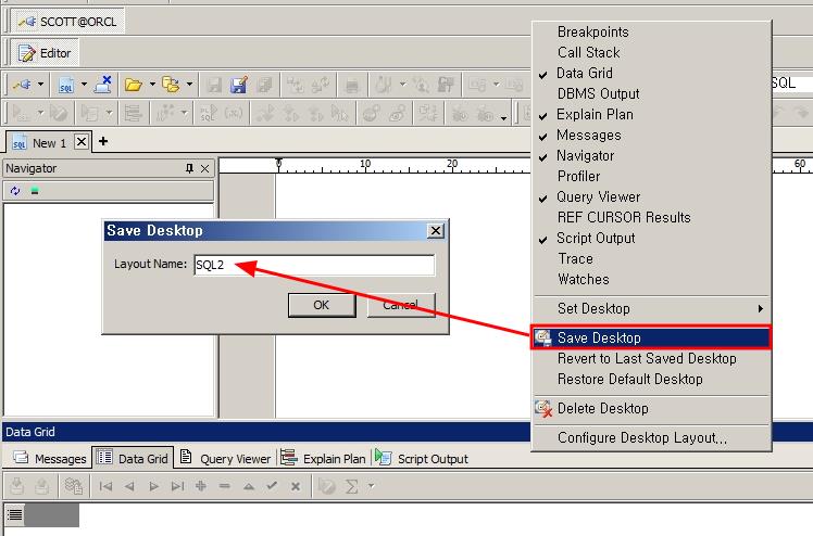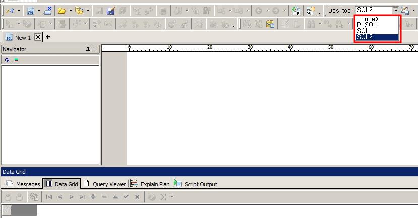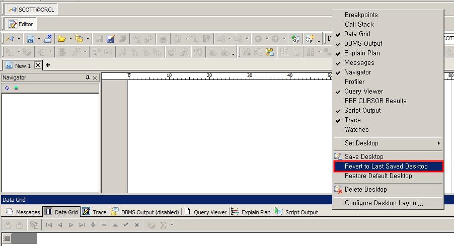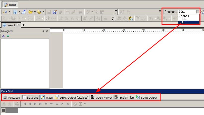 Toad에서 화면 레이아웃 변경 기능 중에 데스크톱 편집 기능이 있는데 이것은 화면 왼쪽의 Navigator와 아래쪽의 결과 창의 레이아웃을 바꿀 수 있습니다.