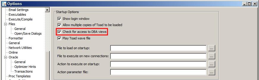 Check for access to DBA Views 옵션이 체크되면 토드에서 DBA_로 시작하는 뷰를 접근할 수 있습니다. 체크되지 않으면 DBA_대신 ALL_ 뷰를 사용합니다. 일반적으로 DBA_는 보안 체크를 하지 않기 때문에 성능상 빠릅니다.