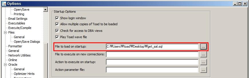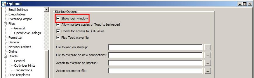 다음은 토드가 시작될 때 수행되는 일들에 대한 설정입니다. Menu > View > Toad Options에서 Startup을 선택합니다. 기본적으로 토드가 처음 시작할 때 접속 창이 뜨는데 Show login window 옵션에 체크를 해제하면 아무 창도 뜨지 않습니다.