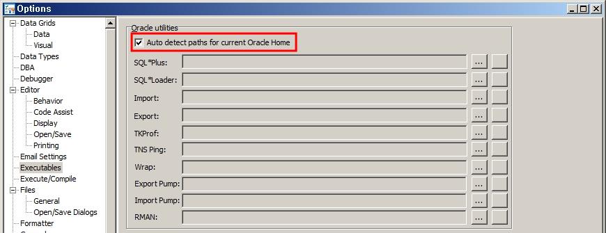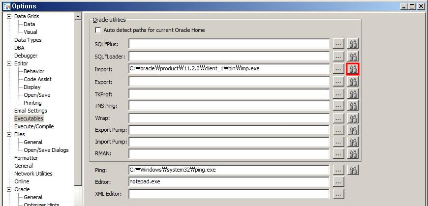 토드에서 사용하는 많은 유틸리티 즉, export나 import, tnsping 등은 오라클 클라이언트가 가지고 있는 오라클의 유틸리티를 사용합니다. 따라서 토드에서 이 기능을 정상적으로 사용하기 위해서는 실행 프로그램을 연결시켜 줘야 합니다. Menu > View > Toad Options에서 Executables을 선택하면 확인할 수 있습니다.