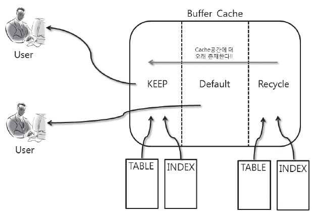 오라클 데이터베이스의 버퍼캐시는 Keep, Default, Recycle 총 세 영역의 다중 버퍼캐시를 제공한다.