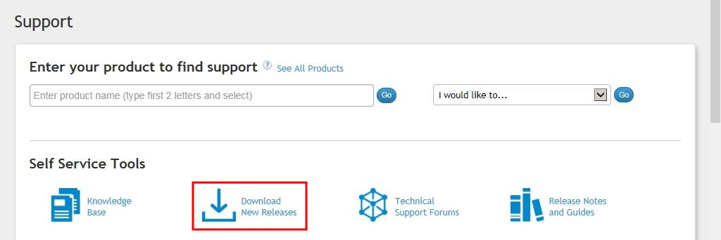 계정이 생성되면 Support 웹 사이트(https://support.quest.com)에서 메뉴 > Support > Download New Release로 이동합니다.