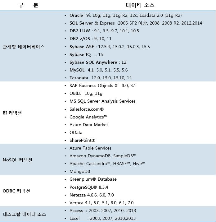 Toad Data Point(V3.6 기준)에서 접속 가능한 데이터 소스입니다.