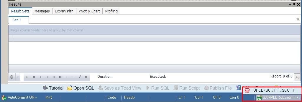 동시에 2개 이상의 데이터베이스에 접속을 했다면 Toad Data Point 창의 아래쪽 상태 표시줄에서 활성화할 DB접속을 선택, 변경할 수 있습니다.