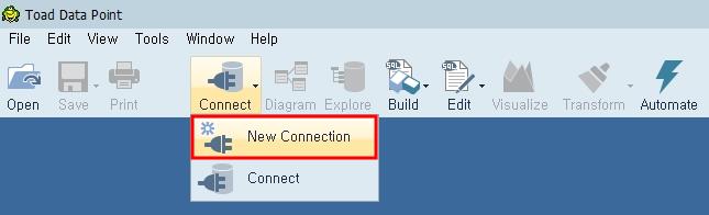 Toad Data Point에서 데이터베이스에 접속하기 위해서는 Menu > File > New > Connection을 선택하거나 툴바의 Connect버튼을 선택합니다.