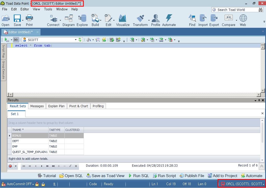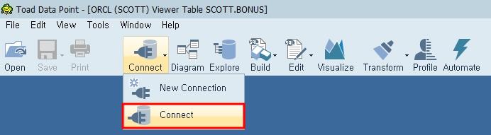 정상적으로 접속되면 Edit나 Explorer 등을 눌러 접속 정보를 확인할 수 있습니다. 현재 활성화된 DB 정보는 Toad Data Point 윈도우 창의 제목 표시줄과 오른쪽 아래의 Toad Data Point상태 표시줄에 표시됩니다.