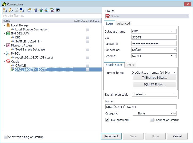 Toad Data Point는 이전에 접속했던 DB정보를 저장하기 때문에 간단하게 접속이 가능하며 패스워드 저장(Save password) 및 시작할 때 자동 접속(Connect on startup) 등의 옵션을 지정할 수 있습니다.