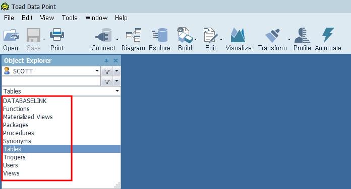 Toad Data Point는 오브젝트를 조회할 수 있는 탐색기(Explorer)를 제공합니다.
