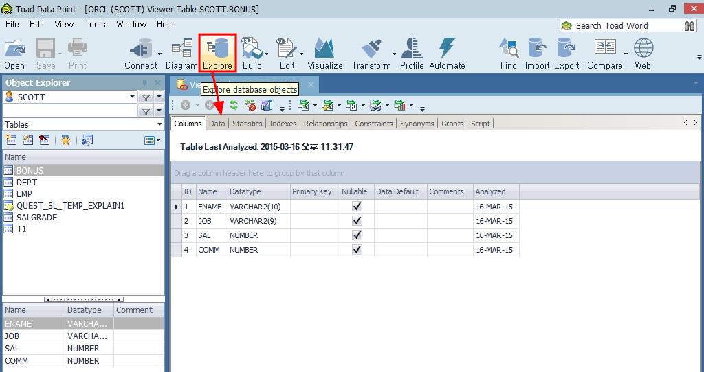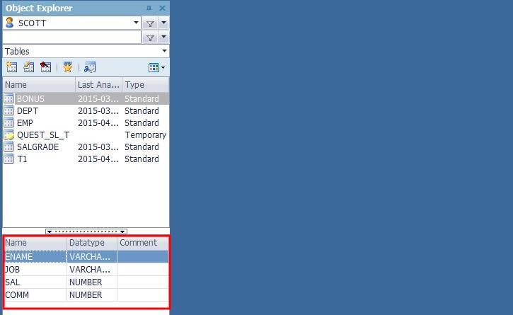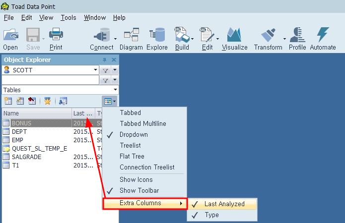 • Toad Data Point 오브젝트에 대한 컬럼 리스트 표시