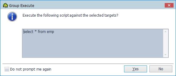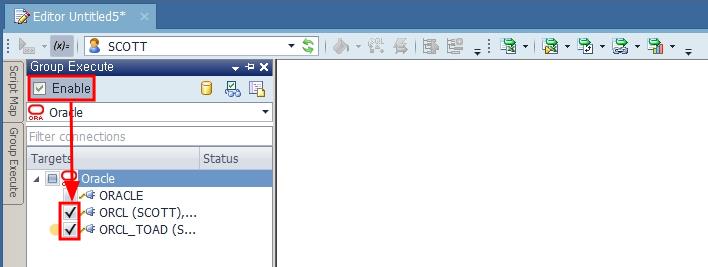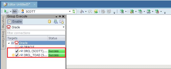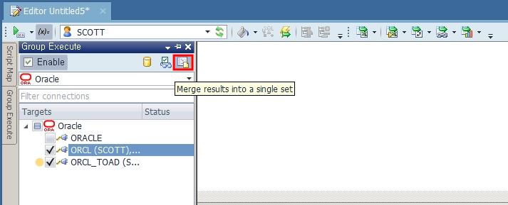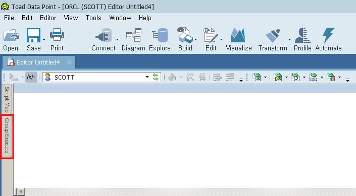 Toad Data Point는 여러 데이터베이스에 대해 동일한 스크립트를 동시(한 번)에 실행시키는 Group Execute 기능을 가지고 있습니다. 실행 방법은 Editor 창 왼쪽에 있는 Group Execute 탭을 선택합니다