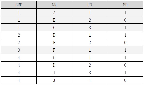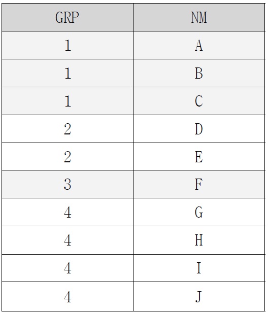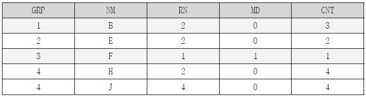 [표 7] 의 결과를 보면 3번 그룹의 자료가 누락된 것을 확인 할 수 있습니다. 3번 그룹엔 자료가 1건 뿐이고 짝수행이 없어서 MOD(rn, 2) = 0 조건에 의해 자료가 누락 된 것입니다. 하지만 짝수행이 없더라도 그룹명칭은 반드시 나와야 한다는 조건이 있으므로 이를 해결하기 위한 추가 조건을 생각해 봐야 합니다.