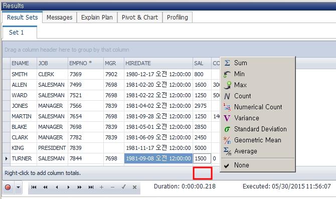 Data Grid 아래의 패널에서 마우스 오른쪽 버튼을 누르면 수식을 쉽게 계산할 수 있는 메뉴를 보여줍니다. 계산 할 컬럼의 아래 부분에서 실행을 해야 합니다.