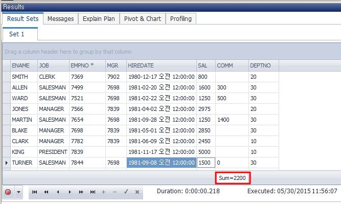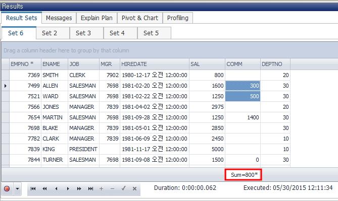 COMM이라는 컬럼에서 Sum을 선택하면 아래처럼 COMM컬럼의 모든 데이터 합이 보여집니다.