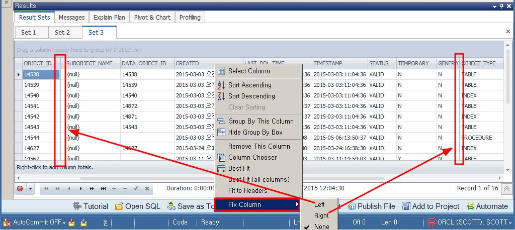 고정된 컬럼을 해제하기 위해서는 Fix Column > None을 선택하거나 SQL문을 다시 실행합니다.