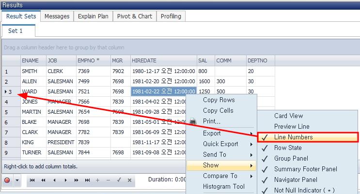 Result Set에서 마우스 오른쪽 버튼 눌러 Show 메뉴를 선택하면 Result Set에서 볼 수 있는 항목을 지정하는 옵션을 볼 수 있습니다. 아래는 Line Number를 선택한 예시입니다
