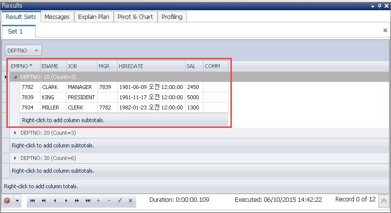 DEPTNO에 대해서 그룹을 지정하면 다음과 같이 결과 값을 확인할 수 있습니다.