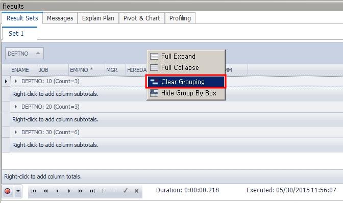 그룹을 해제하기 위해서는 Group By Box에서 마우스 오른쪽 버튼을 눌러 Clear Grouping을 선택하거나 SQL문을 다시 실행하면 됩니다.