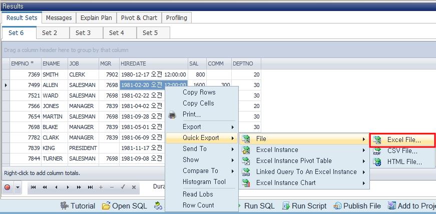 SQL문을 파일로 추출하기 위해서는 Data Grid에 마우스 오른쪽 버튼을 누르고 Export > Export Wizard를 사용하거나 Quick Export메뉴를 선택합니다.