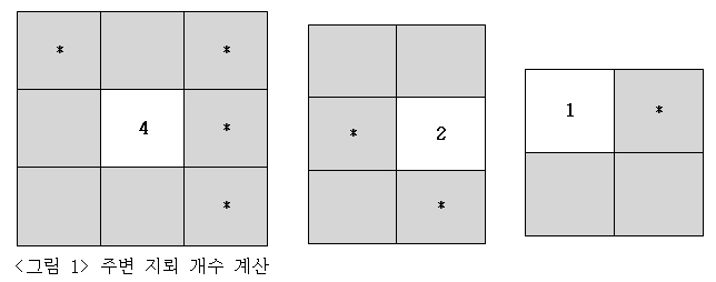 [그림1]은 빈칸에 표시할 지뢰의 수를 세는 방법을 설명하고 있습니다. 첫 번째 빈칸은 주위에 8칸이 있습니다. 이 8칸에 들어있는 지뢰의 총 개수는 4개 입니다. 두 번째 빈칸을 볼까요? 테이블 중앙이 아닌 우측면 중앙에 위치한 빈칸은 5개의 칸으로 둘러싸여 있으며 이 중 두 곳에 지뢰가 존재합니다.