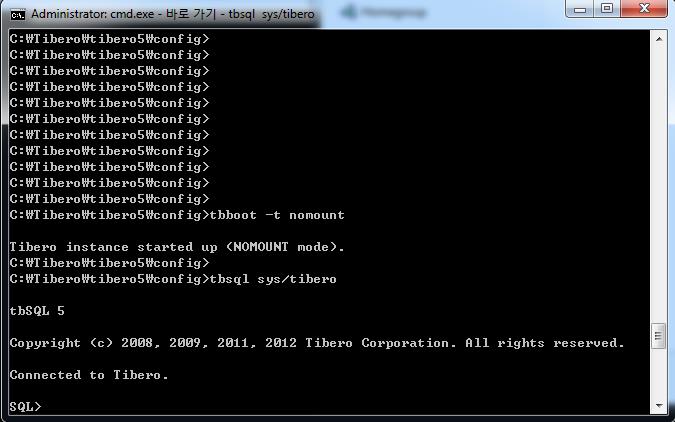 1. NOMOUNT 모드로 Tibero를 기동(tbboot -t nomount)한 후 tbsql로 접속(tbsql sys/tibero)한다.