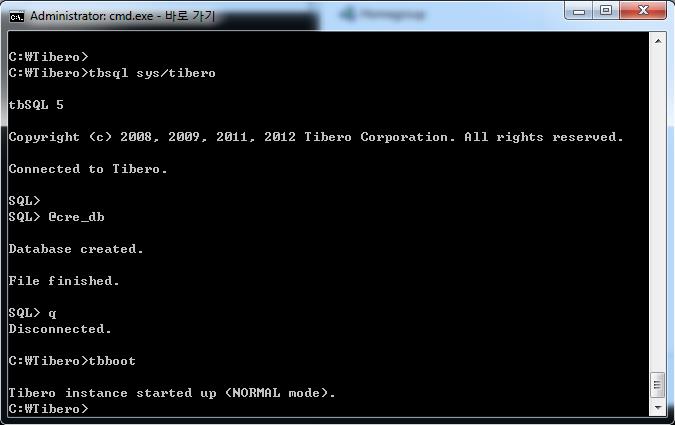 3. DB 생성이 완료되면 tbsql을 빠져나오고 NORMAL 모드로 DB를 재기동(tbboot)한다.