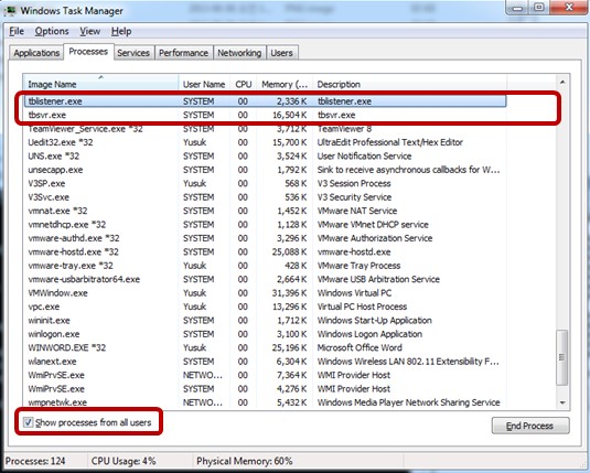 작업 관리자를 실행하여 Tibero 프로세스가 존재하는지 확인한다.