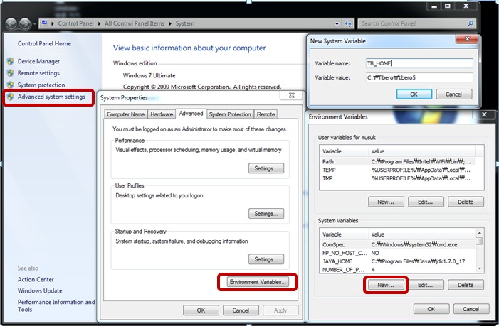 [컴퓨터]에서 오른쪽 마우스 버튼을 클릭한 뒤 [속성] > [고급 시스템 설정] > [환경 변수]를 선택한 후 [시스템 변수]에 설정한다.