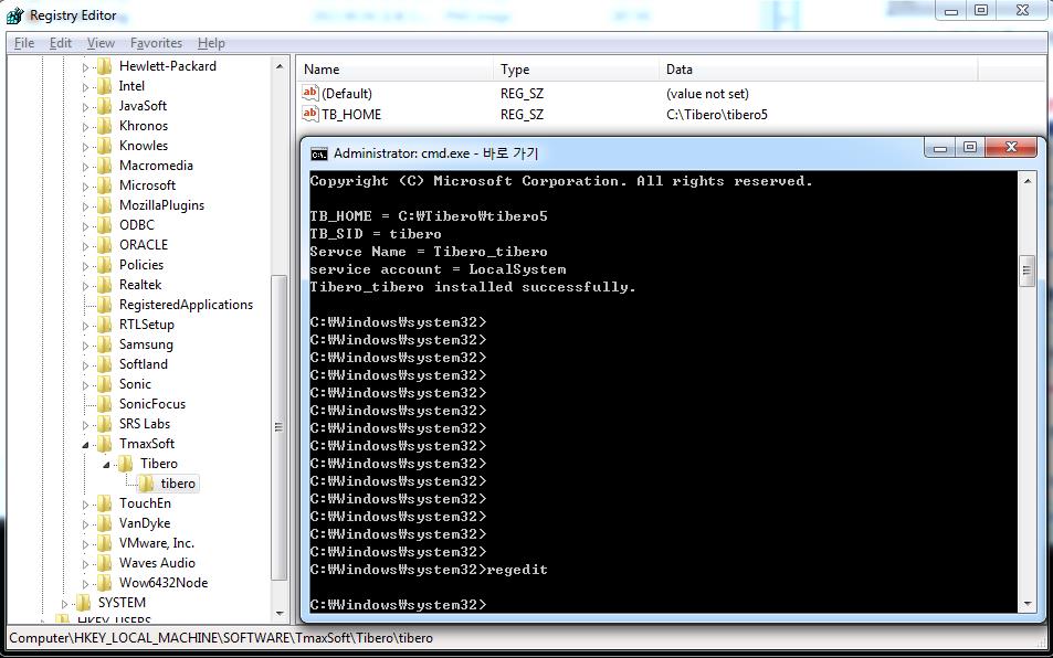 cmd창에서 regedit를 실행해 등록된 TB_HOME과 TB_SID를 확인할 수 있다.