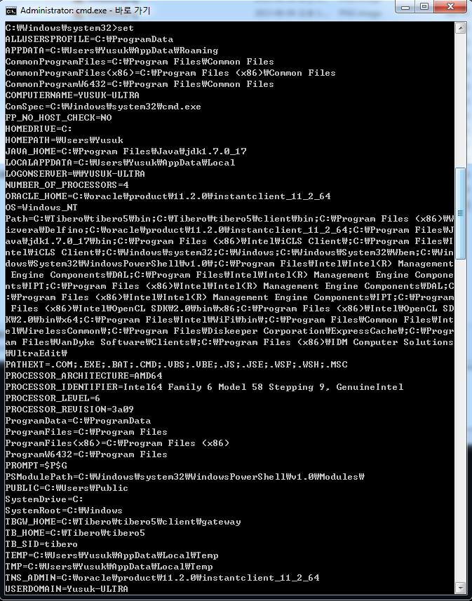 Windows 환경에서 설치할 경우 환경변수 설정 및 서비스 등록 후에 시스템을 재부팅한다. 재부팅 후 cmd창에 set 명령어를 실행하여 환경변수 설정 내용을 확인한다.