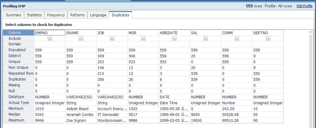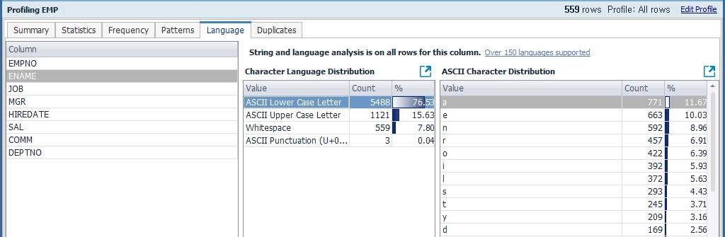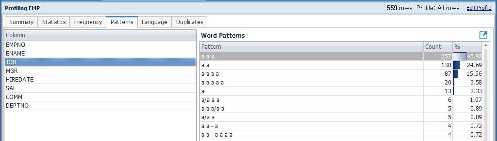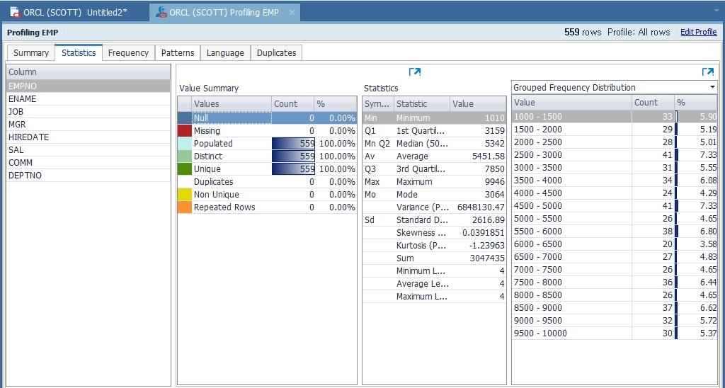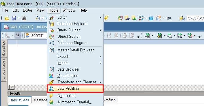 Toad Data Point는 데이터의 내용과 데이터 품질을 검증할 수 있는 Data Profiling 기능을 제공합니다. 이 기능을 사용하면 중복 데이터나 null 값, 문자 패턴, 최대/최소 값 등을 확인할 수 있습니다. 사용 방법은 Menu > Tools > Data Profiling을 선택합니다.