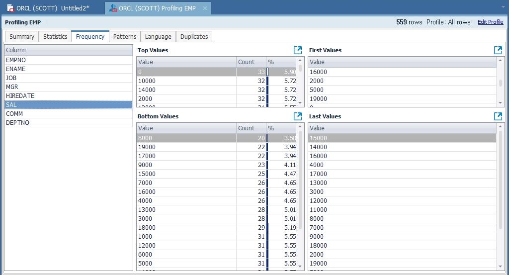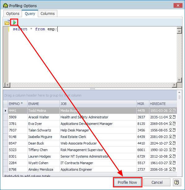 Profiling Options창이 나타나면 SQL문을 입력하고 버튼을 SQL 문장을 실행 할 수 있습니다. 그리고 실행된 SQL 결과를 확인한 후 Profiling Now 버튼을 눌러서 데이터 프로파일링을 진행합니다.