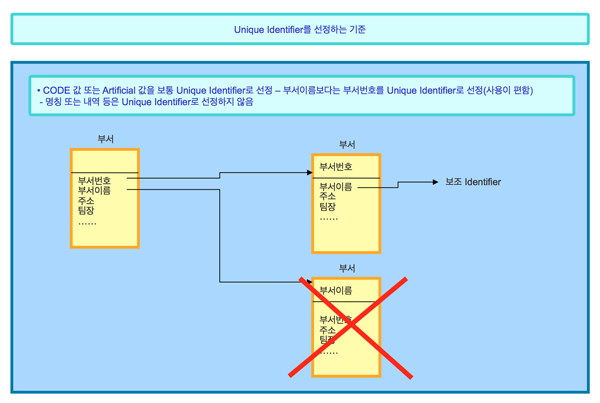 일반적으로 유니크 식별자로는 이름처럼 한글이 저장되는 속성이 아닌 CODE 값이나 Artificial 값이 저장되는 속성을 선정한다.