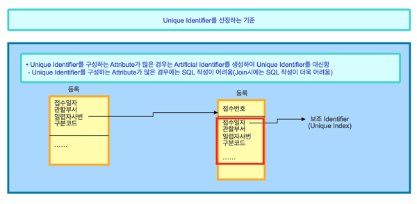 <그림 2>에서 등록 엔티티에서는 4개 속성이 유니크 식별자로 생성된다. 그러므로 접수변호 속성을 인조 유니크 식별자로 구성하는 것이 바람직하다.