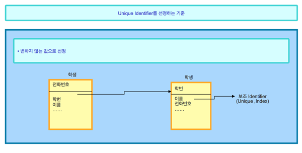 일반적으로 변하는 값은 유니크 식별자로 선정하지 않는다. 예컨대 학생 엔티티에는 유니크한 데이터를 저장하는 속성으로 전화번호 속성과 학번 속성이 있다.